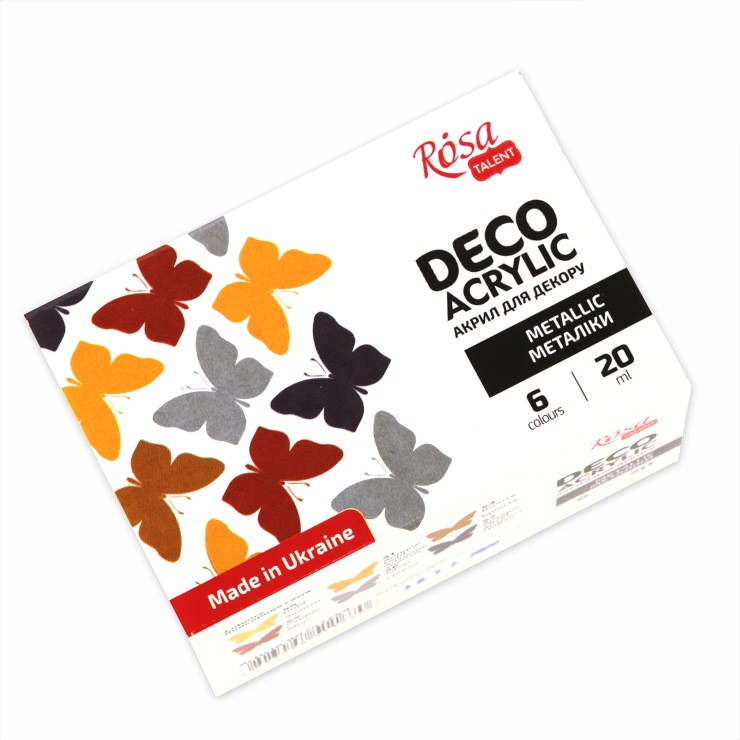 Штрихкод товару: 4823098511670Виробник: ROSAБренд: ROSA TALENTЕфект: МеталікОб'єм/вага: 20 мл Набір акрилових фарб від ТМ ROSA TALENT - використовуються в вільному розписі для створення кольорових малюнків.Фарби легко наносяться на будь-яку тверду поверхню: кераміку, дерево, папір, картон, ґрунтоване полотно, та ін., добре змішуються, швидко висихають.Після висихання фарби створюють ефект металічного покриття. До складу наборів входить 6 кольорів по 20мл: Античне золото, Античне срібло, Бронза, Золото, Мідь, Срібло.