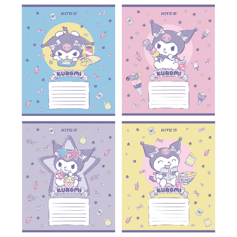12 білих щільних листів у косій лінії — ідеально підходить для початкової школи та підготовчих класів;формат А5 (210 х 148 мм) — стандартний і універсальний;4 варіанти дизайну обкладинки в єдиній стилістиці; улюблена дитяча ліцензія Kuromi; яскраві тематичні форзаци; Особливості дизайну ефектно підкреслені гібридним і УФ-лаком.
