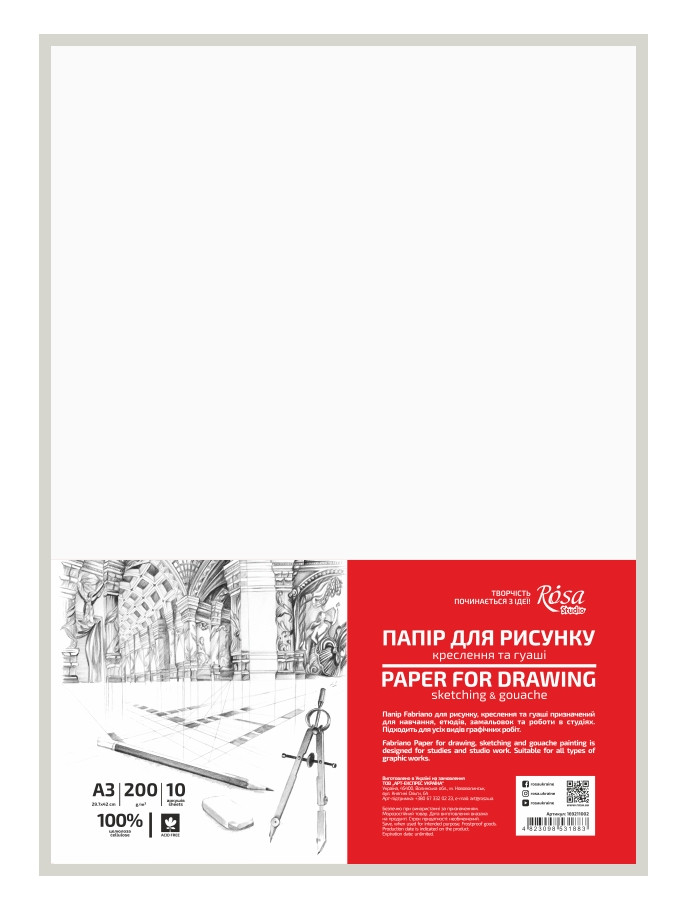 Папір для рисунка, креслення та гуаші від ROSA Studio відтепер можна придбати пофасованим в пакетах. Завдяки такому рішенню легко доповнити папку з папером, яка вже у Вас в роботі. Італійський папір Fabriano Start має дрібнозернисту текстуру, спеціальну проклейку паперу та щільність 200г/м2, що робить його оптимальним для рисунку та креслення. На гладкій, злегка шорсткуватій поверхні паперу, штрихи лягають чітко та рівномірно. Папір підходить для різних технік рисунку - штрихування, розтушовування, для роботи з графітними паличками. Також може використовуватись для:роботи тушшю, для каліграфії та письма;робіт лінерами, ручками, фломастерами, маркерами на водній та акриловій основі;для гуаші та ілюстрації. Цупкий та щільний папір та спеціальна проклейка запобігає просочуванню гуаші, туші, маркерів на водній основі на зворотну сторону паперу. Папір для рисунку ROSA Studio не зминається при терті ластиком та витримує до 10-ти стирань. Основні характеристики:• Італійський безкислотний папір Fabrianо із 100% целюлози;• Щільність 200г/м2 - оптимальна для більшості технік рисунку;• Дрібнозерниста текстура - універсальна для різних технік;• Ідеальний для рисунка, креслення, гуаші, а також для роботи тушшю, для каліграфії та письма;• Завдяки якісній проклейці, папір витримує до 10-ти стирань гумкою. Папір для рисунка, креслення та гуаші від ROSA Studio рекомендовано для учнів, студентів, аматорів та новачків.